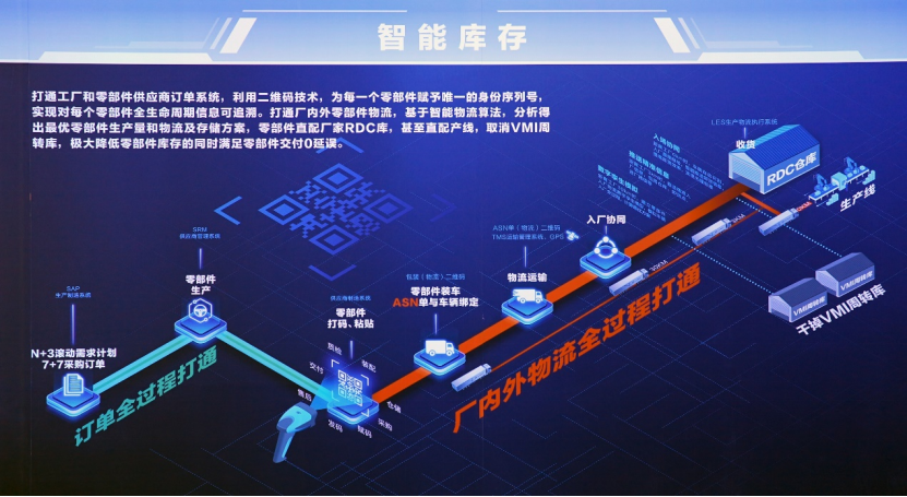 智能庫存——打通工廠和零部件供應商訂單系統,利用二維碼技術,為每一個零部件賦予唯一的身份序列號,實現對每個零部件全生命周期信息可追溯。打通廠內外零部件物流,基于智能物流算法,分析得出最優零部件生產量和物流及存儲方案,零部件直配廠家RDC庫,甚至直配產線,取消VMI周轉庫,極大降低零部件庫存的同時滿足零部件交付0延誤。