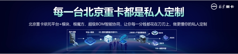依托“根魔方”技術,北京重卡通過12大類、數百項內容的定制,圍繞根車型全配置開發,30+根車型可配置出190+個銷售車型,加上用戶的個性化配置選擇,可實現超20000+種產品配置的自由組合,覆蓋95%的市場。
