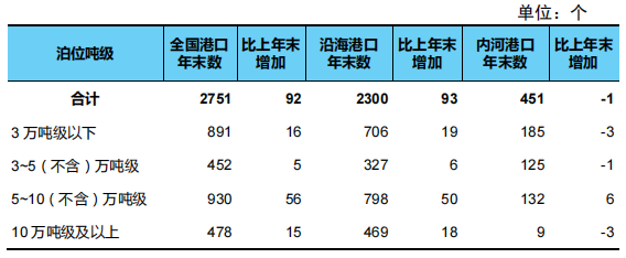 年末全國港口萬噸級及以上泊位2751個,比上年末增加92個。從分布結構看,沿海港口萬噸級及以上泊位2300個、增加93個,內(nèi)河港口萬噸級及以上泊位451個、減少1個。從用途結構看,專業(yè)化萬噸級及以上泊位1468個、增加41個,通用散貨萬噸級及以上泊位637個、增加41個,通用件雜貨泊位434個、增加13個。