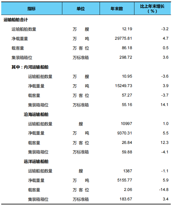 年末全國擁有水上運輸船舶12.19萬艘,比上年末減少0.40萬艘,凈載重量2.98億噸、增加0.13億噸,載客量86.18萬客位、增加0.40萬客位,集裝箱箱位298.72萬標準箱、增加10.29萬標準箱。