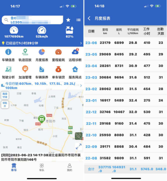 于濤用手機向我們展示了他的汕德卡車載智能通記錄的車輛運營信息,目前,這輛汕德卡的行駛里程已經超過107萬公里。據他介紹,車輛共運營了3年零1個月,除了正常的保養維護,從未大修過,并且始終保持著高出勤,用高效可靠表現回饋著他始終如一地信賴。
