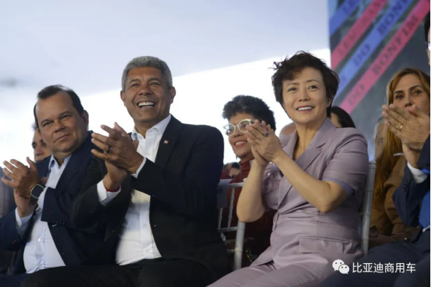 · 巴西巴伊亞州副州長熱拉爾多·朱尼奧爾、巴西巴伊亞州州長杰羅尼莫·羅德里格斯、比亞迪股份有限公司執行副總裁兼比亞迪美洲地區總裁李柯(從左到右)