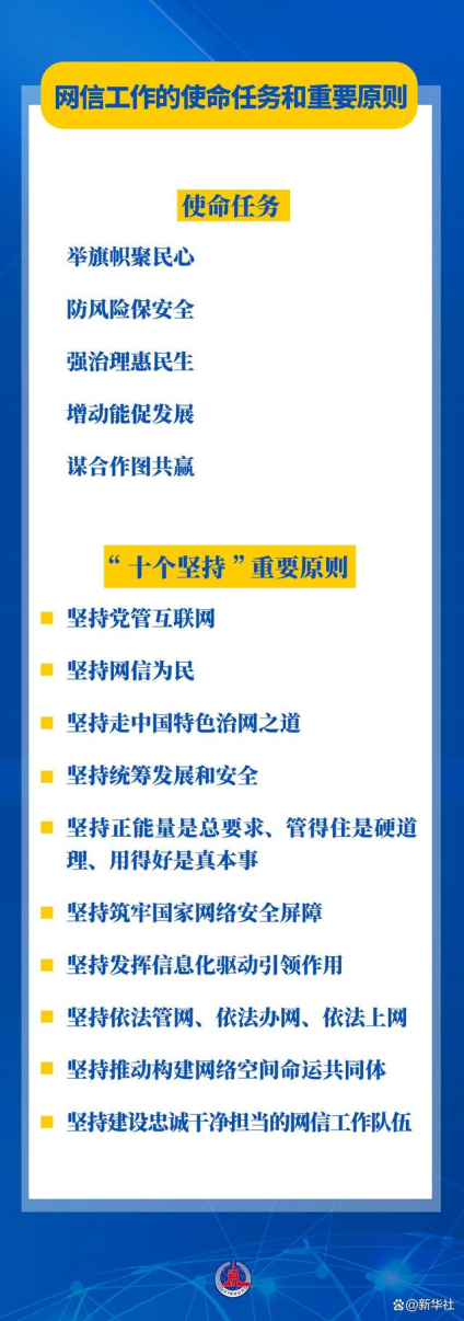 習近平總書記鮮明提出的網信工作“5個方面、30個字”的使命任務,涵蓋互聯網內容建設、網絡安全、網絡惠民、信息化建設、國際網絡空間治理等,“十個堅持”重要原則進一步豐富和發展了習近平總書記關于網絡強國的重要思想,把黨對網信工作的規律性認識提升到全新高度。總書記提出的使命任務和重要原則,具有很強的政治性、戰略性、指導性,既著眼當前,又謀深慮遠,為做好新時代新征程網信工作指明了前進方向,為推進實現網絡強國提供了根本遵循。
