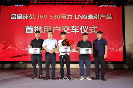 ▲一汽解放銷售公司副總經理霍明為J6V 530馬力LNG牽引車客戶頒發交車鑰匙