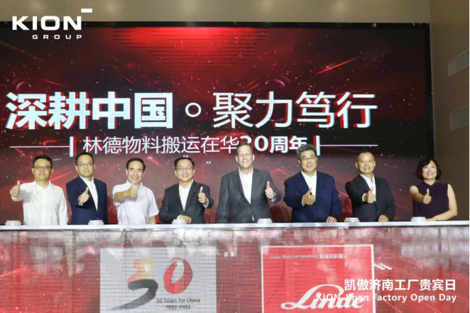 2023年8月16日,全球知名的物料搬運設備和解決方案提供商——林德叉車在凱傲濟南工廠開啟“林德物料搬運在華三十周年慶典”。林德物料搬運母公司、凱傲集團首席執行官Rob Smith,凱傲集團董事兼凱傲亞太及美洲區總裁郭進鵬,中國工程機械工業協會副會長、工業車輛分會會長唐超,中國工程機械工業協會工業車輛分會秘書長張潔,中國物流與采購聯合會會長助理、物流裝備委主任馬增榮,中國物流和采購聯合會、冷鏈專業委員會秘書長秦玉鳴,凱傲監事會成員、山東重工集團執行總裁江奎,山東重工集團黨委副書記、副總經理王志堅先生以及眾多林德物料搬運的客戶及合作伙伴代表們蒞臨現場,共襄林德物料搬運在華三十周年慶典之喜。