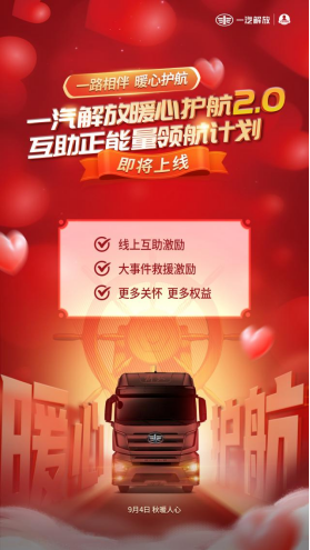 2023年9月4 日,解放暖心護航計劃迎來全新升級,“一汽解放暖心護航2.0——互助正能量領航計劃”重磅發布,在卡友地帶APP同步設立解放品牌互助專區,為解放用戶提供線上、線下一體的救助幫扶,鼓勵和倡導更多卡友加入到互幫互助“大家庭”。