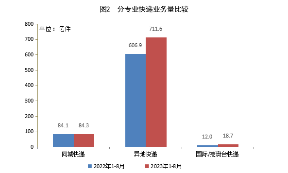 1-8月,同城快遞業務量累計完成84.3億件,同比增長0.2%;異地快遞業務量累計完成711.6億件,同比增長17.3%;國際/港澳臺快遞業務量累計完成18.7億件,同比增長56.3%。