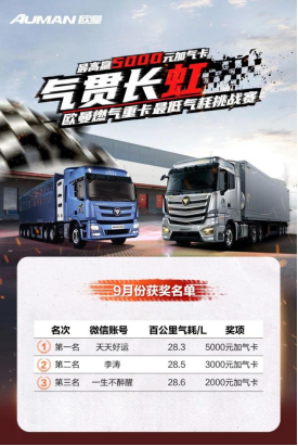 其中,來自河南的李師傅開歐曼GTL 15L燃?xì)庵乜ǎ儇浥苄陆谝粋€(gè)月的運(yùn)輸過程中,百公里氣耗低到了28.3L升。不僅大幅提升運(yùn)輸效益,更是一舉奪得9月份挑戰(zhàn)賽第一名,贏得一等大獎(jiǎng),對(duì)于這段征程,他感促頗深:“燃?xì)庵乜ㄟ€得看歐曼,就是能省,就是能賺,現(xiàn)在的行情下,這就是跑運(yùn)輸賺錢的利器!”