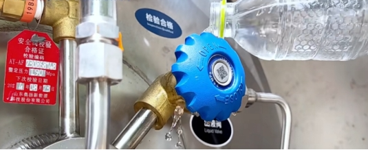 務(wù)必佩戴手套操作氣瓶上的出液閥、增壓閥、放空閥,避免低溫凍傷。順時針旋轉(zhuǎn)為關(guān)閉閥門,逆時針旋轉(zhuǎn)為開啟閥門。開啟閥門到最大角度時,建議回轉(zhuǎn)10-20度,以避免低溫結(jié)冰凍住閥芯。如果閥門被凍住,也不要用錘子和撬棍敲擊,應(yīng)該用溫水持續(xù)澆注,融化冰霜后再對閥門進(jìn)行操作。