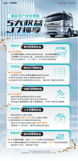 J7 LNG車,同時享有一汽解放NG產品專屬服務政策,用戶擁有超長質保、不限里程的感動服務。一汽解放的售后服務如此“給力”,就是為了能讓廣大解放用戶安安心心把錢賺,踏踏實實做您路上的好伙伴!