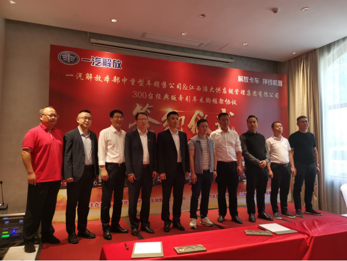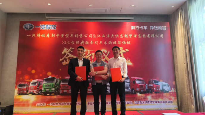 活動最后,江西浩大供應鏈管理集團有限公司董事長陳建勇、一汽解放本部中重型車銷售公司高級主任管理師楊天明、萍鄉三鑫達汽車貿易有限公司董事長徐定河交換簽約本并實地走訪江西浩大供應鏈管理集團有限公司的用車現場。