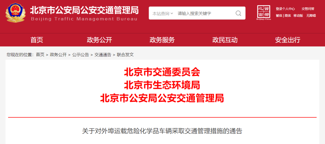 為保證本市道路交通安全、降低機動車污染排放,根據道路交通安全、危險化學品運輸和生態環境保護等法律法規的有關規定,決定自2023年12月1日至2024年11月30日,在北京市行政區域內道路,對外埠運載危險化學品車輛采取以下交通管理措施: