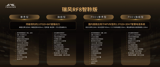 本次廣州車展,江淮瑞風(fēng)現(xiàn)場首發(fā)瑞風(fēng)RF8智聆版,涵蓋燃油與PHEV插混四款車型。PHEV旗艦型,預(yù)售價格為23.99萬;PHEV尊貴型,預(yù)售價格21.99萬;燃油旗艦型,預(yù)售價格18.99萬;燃油尊貴型,預(yù)售價格16.99萬。