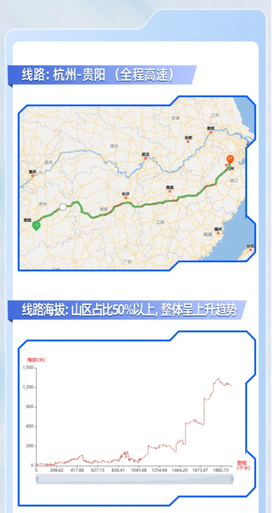 萬師傅的主要運營線路為貴州-杭州,該線路整體重山區占比多,海拔起伏變化大,尤其湘西、貴陽路段,基本屬于全山區路段,有多處大長坡,需翻越武陵山、雪峰山進入貴州,整個行程后半段基本以爬坡為主,線路海拔呈現整體上升趨勢。