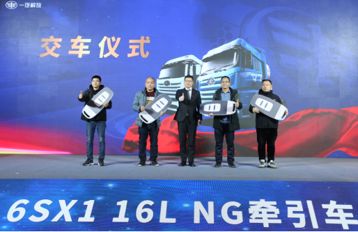 在交車環(huán)節(jié),一汽解放營(yíng)銷總部總經(jīng)理、黨委書(shū)記紀(jì)勝師為預(yù)購(gòu)客戶送出解放交車鑰匙,并與現(xiàn)場(chǎng)所有來(lái)賓共慶解放J7/J6V 6SX1 16L NG牽引車榮耀上市。愿解放煥發(fā)的榮光照耀進(jìn)所有卡友的運(yùn)輸坦途,解放將陪伴每一位客戶駛?cè)雱?chuàng)富之路,見(jiàn)證光輝里程。