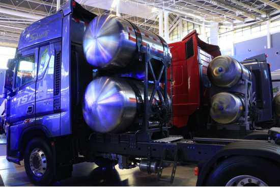 不僅如此,會議展出的豪沃TS7-H還搭載了兩個1350L的LNG氣瓶,大致可容納1000kg LNG。對于快遞快運等高效物流行業而言,只需在起點加注一次便可實現近4000公里運輸無憂,在北方這或許可能只是加氣次數多少的問題,但在南方,特別是加氣站數量稀少,但快遞快運需求旺盛的城市,這樣的TS7-H雙氣瓶車型,可以完美解決他們以往想用燃氣車但無處加氣的問題;對于普貨或冷鏈運輸等行業而言,單程3000多公里的持久續航,也能夠滿足大多數場景運營所需,為更多物流企業及卡友帶來經濟實惠。
