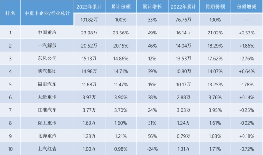 2023年,是我國(guó)商用車產(chǎn)業(yè)轉(zhuǎn)型升級(jí)和高質(zhì)量發(fā)展的關(guān)鍵時(shí)期,這一年,中重卡市場(chǎng)重回百萬輛規(guī)模!據(jù)中汽協(xié)數(shù)據(jù)顯示:全年商用車?yán)塾?jì)銷售403.09萬輛,同比增長(zhǎng)22%;其中,中重卡市場(chǎng)累計(jì)銷售101.82萬輛,同比上漲33%,成為行業(yè)增長(zhǎng)的主要?jiǎng)恿υ础?023年,商用車行業(yè)具體有哪些看點(diǎn)和亮點(diǎn)?誰是中重卡市場(chǎng)“大贏家”?我們逐一來分析——
