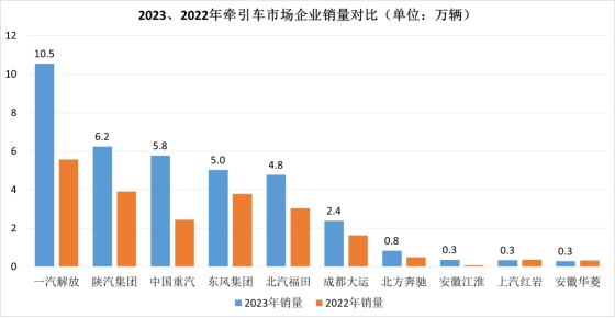 上圖可見,大多數(shù)企業(yè)2023年?duì)恳囦N量都實(shí)現(xiàn)了增長(zhǎng),銷量前十企業(yè)中解放、重汽、陜汽、北方奔馳和安徽江淮增速迅猛,分別增長(zhǎng)89.2%、135.8%、60.1%、72.6%和477.9%。在2023年?duì)恳囀袌?chǎng)約15.6萬輛的“增量”中,貢獻(xiàn)量最大的是仍是排名首位的解放,牽引車銷量?jī)粼鲩L(zhǎng)4.9萬輛,對(duì)整個(gè)市場(chǎng)增量的貢獻(xiàn)度達(dá)到31%;第二名重汽,凈增長(zhǎng)超2萬輛,東風(fēng)、陜汽和福田也均增長(zhǎng)超萬輛。
