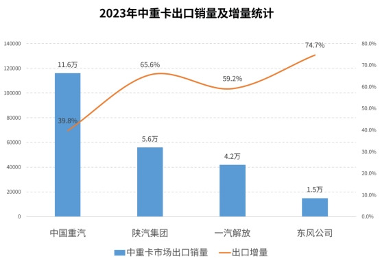 除了上述國(guó)內(nèi)幾個(gè)熱點(diǎn)市場(chǎng)外,出口也是2023年中重卡乃至整個(gè)汽車市場(chǎng)的一大亮點(diǎn),中國(guó)商用車企業(yè)憑借優(yōu)異的產(chǎn)品,積極走出國(guó)門,向全世界展示其發(fā)展成就。據(jù)中汽協(xié)數(shù)據(jù)顯示:2023年我國(guó)汽車出口延續(xù)快速增長(zhǎng),商用車出口77萬輛,同比增長(zhǎng)32%。中重卡市場(chǎng),重汽出口銷量以11.6萬輛位居首位;陜汽、解放位居其后,出口銷量分別為5.6萬輛和4.2萬輛;重汽、解放、東風(fēng)、陜汽的出口增量分別達(dá)到39.8%、59.2%、74.7%、65.6%,四大商用車巨頭均跑贏“大盤”。
