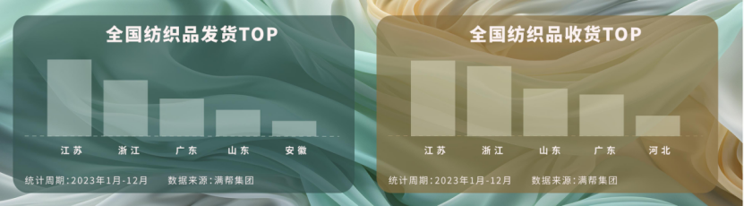 俗話說,世界紡織看中國,中國紡織看江浙。憑借約占全國40%紡織業規模,江蘇、浙江兩省憑借實力成了紡織品收發兩端的“流量擔當”。在發貨量上,憑借著“榜一”“榜二”位置的硬核實力,江浙僅兩省的發貨噸數,就堪比廣東、山東、安徽三省收貨噸數之和;而在收貨噸數前五位榜單上,江浙兩省依然領跑,不僅領先于山東、廣東、河北等地,兩省收貨噸數之和更是兩倍于榜單后三位之和。