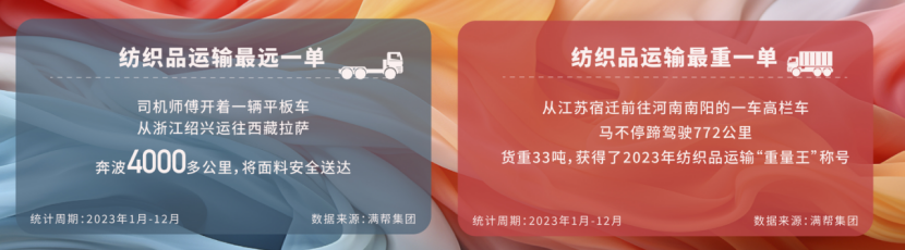 2023年,面對出口承壓背景,內銷市場對紡織行業平穩發展的“壓艙石”作用更為明顯。滿幫貨運數據顯示,2023年1-12月,平臺紡織品發貨噸數同比上升7.2%。在平臺上,從浙江紹興出發的紡織品面料被送往4000公里外的西藏拉薩,成就近一年最遠紡織品運輸訂單。以織“線”相連,溫潤的南方與粗獷的西北被緊密連接。