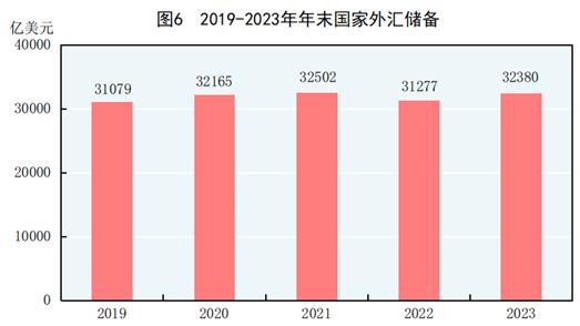 年末國家外匯儲備32380億美元,比上年末增加1103億美元。全年人民幣平均匯率為1美元兌7.0467元人民幣,比上年貶值4.5%。