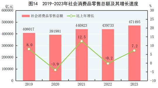 全年社會消費品零售總額471495億元,比上年增長7.2%。按經營地分,城鎮消費品零售額407490億元,增長7.1%;鄉村消費品零售額64005億元,增長8.0%。按消費類型分,商品零售額418605億元,增長5.8%;餐飲收入52890億元,增長20.4%。服務零售額[36]比上年增長20.0%。