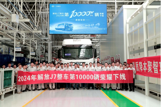2024年5月28日中午11時30分,一汽解放J7智能工廠迎來了具有里程碑意義的時刻——2024年第10000輛整車正式下線,較2023年提前5個月突破萬輛。