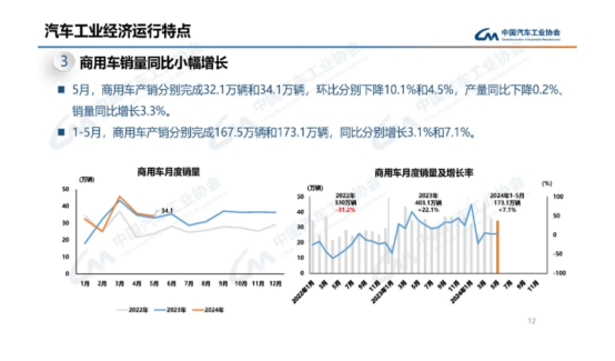 數(shù)據(jù)顯示,5月,我國商用車產(chǎn)銷分別完成32.1萬輛和34.1萬輛,環(huán)比分別下降10.1%和4.5%,市場步入“盤整期”。商用車市場1-5月產(chǎn)銷分別實現(xiàn)167.5萬輛和173.1萬輛,同比分別增長3.1%和7.1%。對于市場“環(huán)比下降,同比上升”的小幅震蕩,中汽協(xié)表示,5月,我國經(jīng)濟總體產(chǎn)出繼續(xù)擴張,企業(yè)生產(chǎn)經(jīng)營活動保持恢復(fù)發(fā)展態(tài)勢。
