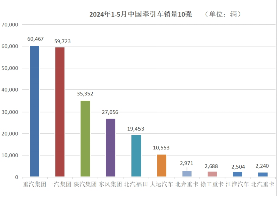 從細分市場來看,對于中國牽引車市場的“榜首之爭”尤為激烈。今年1-5月,重汽累計銷售牽引車60,467輛,位居行業(yè)第一;一汽解放步步緊逼,前5個月累計銷量59,723輛,排名第二,兩大巨頭合計分食了今年牽引重卡市場近五成的份額(49.7%);陜汽牽引車銷量35,352輛,位列行業(yè)第三;東風(fēng)、福田分別銷售27,056和19,453輛,在牽引車銷量排名中位居第四和第五位。