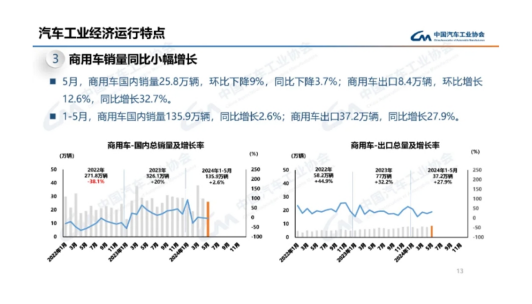 5月,商用車國內(nèi)銷量25.8萬輛,國內(nèi)市場環(huán)比、同比均呈下降趨勢;與之形成鮮明對比的是,商用車出口達8.4萬輛,環(huán)比增長12.6%,同比增長32.7%。今年1-5月,商用車國內(nèi)銷量135.9萬輛,同比增長2.6%;商用車出口37.2萬輛,同比增長27.9%。汽車出口延續(xù)快速增長態(tài)勢,中國品牌繼續(xù)保持良好表現(xiàn)。