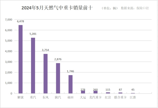 天然氣細分市場銷量依然在“峰值”,5月份國內(nèi)天然氣中重卡實銷2.09萬輛,同比增長84%。今年3、4、5月市場連續(xù)三個月銷量達2萬輛以上。解放、重汽、東風(fēng)、陜汽和福田,5家車企天然氣中重卡銷量均在“千輛”級以上。其中,解放單月銷量6,478輛,市場份額31.0%,持續(xù)蟬聯(lián)天然氣中重卡銷量榜首。重汽月度銷量5,281輛,市場份額25.3%,排名行業(yè)第二;東風(fēng)銷量3,754輛,市場份額18.0 %;陜汽銷量2876輛,市場份額13.8 %;福田銷量1746輛,市場份額8.7%。