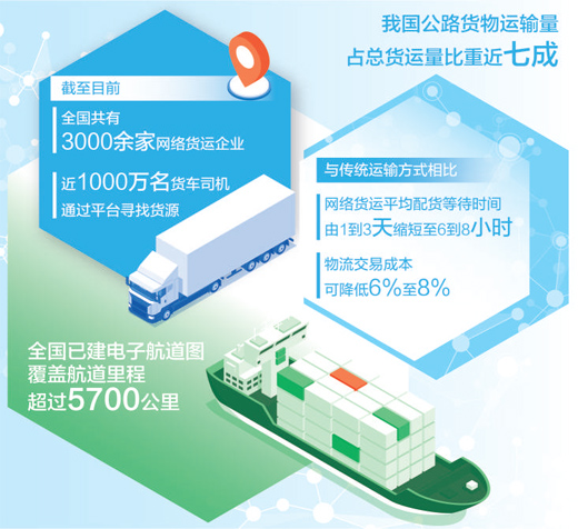 我國公路貨物運輸量占總貨運量比重近七成,網絡貨運新模式的出現,在降低全社會物流成本的同時,改變了長期以來公路運輸市場“小、散、亂”的特點。相關調查顯示,與傳統運輸方式相比,網絡貨運平均配貨等待時間由1到3天縮短至6到8小時,物流交易成本可降低6%至8%。