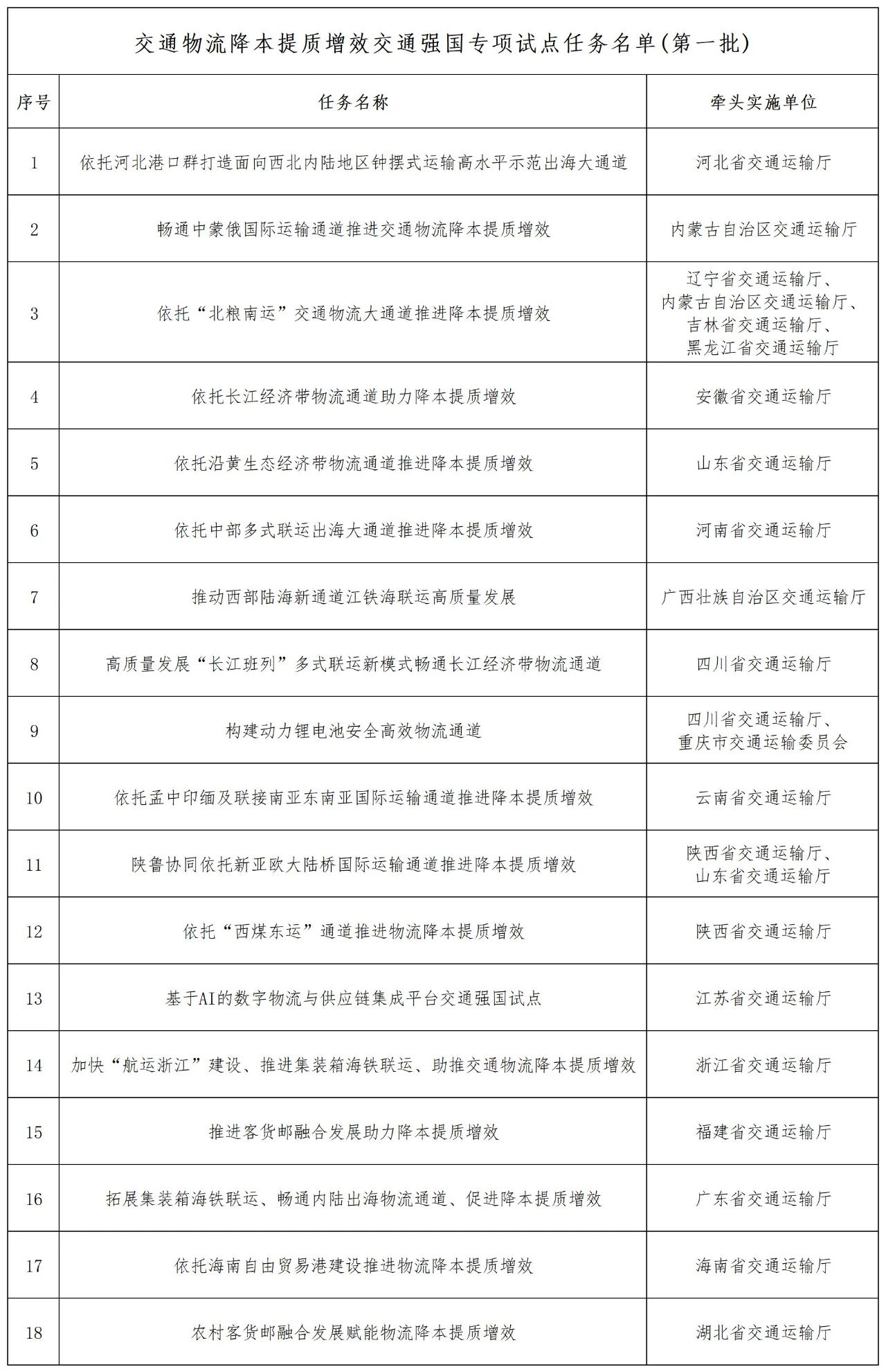 首批交通物流降本提質增效交通強國專項試點任務名單公布
