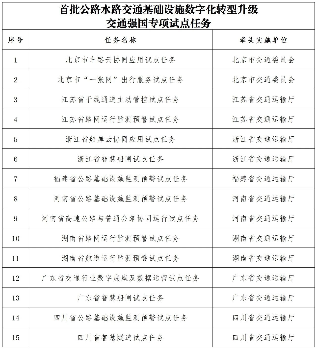 - 首批公路水路交通基礎(chǔ)設(shè)施數(shù)字化轉(zhuǎn)型升級交通強國專項試點任務(wù)名單公布