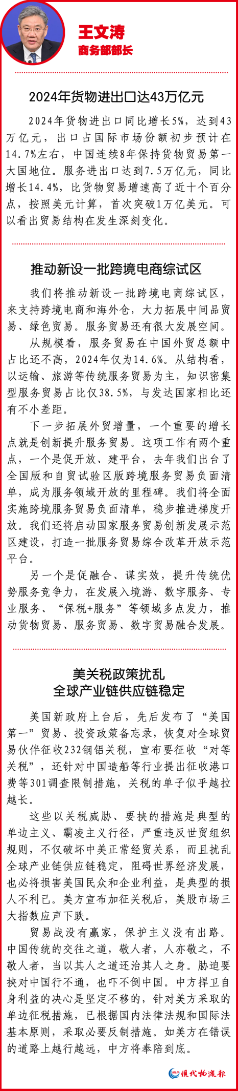 3月6日,十四屆全國人大三次會議在梅地亞中心舉行記者會,國家發展和改革委員會主任鄭柵潔、財政部部長藍佛安、商務部部長王文濤、中國人民銀行行長潘功勝、中國證券監督管理委員會主席吳清就發展改革、財政預算、商務、金融證券等相關問題回答中外記者提問。