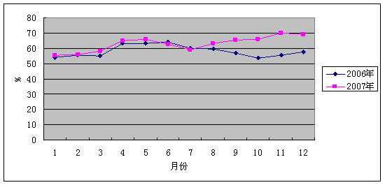從購進價格指數來看,該指數自去年11月份以來,一直保持在55%以上,特別是2007年3月份以來,呈明顯的上升趨勢,4、5月份達到65%左右,6、7兩月略有回落,8月份以后再現持續攀升,不斷創下最高記錄。2007年1-12月該指數平均值為63%,高出去年同期平均值4.8個百分點,最低值也達到55.4%,高出去年同期最低值大約2個百分點。分行業來看,購進價格指數較高、上升較快的行業主要分為三類: