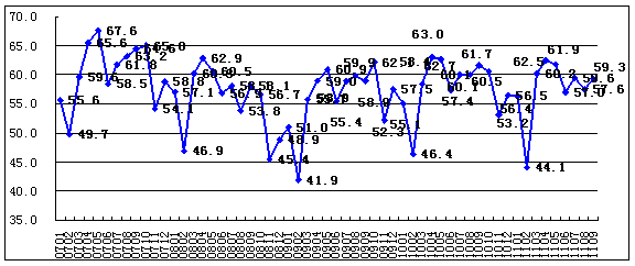 2011年9月,中國物流與采購聯(lián)合會(CFLP)發(fā)布的中國非制造業(yè)商務活動指數為59.3%,比上月上升1.7個百分點。本月中國非制造業(yè)PMI各單項指數中,存貨指數較上月上升,收費價格指數較上月持平,其余各指數的環(huán)比均呈現不同程度回落。