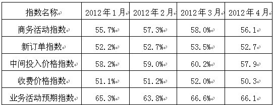 中國(guó)物流與采購(gòu)聯(lián)合會(huì)、國(guó)家統(tǒng)計(jì)局服務(wù)業(yè)調(diào)查中心發(fā)布的2012年4月份的中國(guó)非制造業(yè)商務(wù)活動(dòng)指數(shù),經(jīng)季節(jié)調(diào)整后為56.1%,比上月回落1.9個(gè)百分點(diǎn)。由于非制造業(yè)沒(méi)有綜合指數(shù),通常以商務(wù)活動(dòng)指數(shù)來(lái)反映非制造業(yè)經(jīng)濟(jì)的總體變化。
