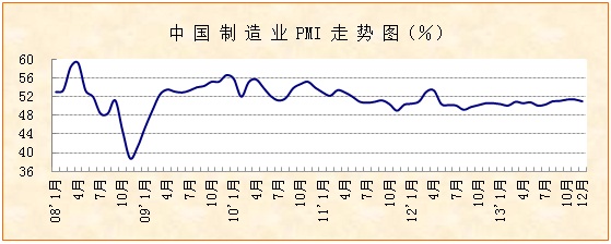 中國物流與采購聯(lián)合會(huì)、國家統(tǒng)計(jì)局服務(wù)業(yè)調(diào)查中心發(fā)布的2013年12月份中國制造業(yè)采購經(jīng)理指數(shù)(PMI)為51.0%,比上月下降0.4個(gè)百分點(diǎn)。新訂單、生產(chǎn)、從業(yè)人員等主要分項(xiàng)指數(shù)以及大中小型企業(yè)指數(shù)均呈小幅回落,顯示當(dāng)前經(jīng)濟(jì)運(yùn)行穩(wěn)中偏弱。