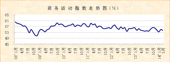 中國物流與采購聯合會、國家統計局服務業調查中心發布的2014年3月份商務活動指數達到54.5%,顯示非制造業經濟仍處于適度較快的增長區間。該指數較上月小幅回落0.5個百分點,以旅游、交通、餐飲等行業經營活動受節后需求淡季的影響,出現了回調,成為本月指數回落的主要原因。從主要分項指數和分行業數據變化看,仍存在著有利于經濟平穩運行的積極因素。