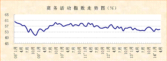 中國物流與采購聯合會、國家統計局服務業調查中心發布的2014年4月份商務活動指數達到54.8%,環比上升0.3個百分點。新訂單指數止跌趨穩,與上月持平;中間投入價格指數連續三個月穩定在52%附近,收費價格指數連續三個月穩定在49%附近;企業預期保持在61%以上的高位,與上月持平。綜合主要數變化,市場經營活動較上月加快,需求增速沒有進一步放緩,價格走勢穩定,企業預期依然較好,非制造業經濟延續快速增長勢頭,有利于經濟繼續走穩向好。