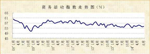 中國(guó)物流與采購(gòu)聯(lián)合會(huì)、國(guó)家統(tǒng)計(jì)局服務(wù)業(yè)調(diào)查中心發(fā)布的2014年8月份商務(wù)活動(dòng)指數(shù)較上月上升0.2個(gè)百分點(diǎn),較去年同期上升0.5個(gè)百分點(diǎn),保持在54.4%的較高水平,表明非制造業(yè)市場(chǎng)活動(dòng)穩(wěn)中略升。