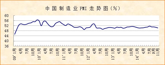 中國物流與采購聯(lián)合會、國家統(tǒng)計局服務(wù)業(yè)調(diào)查中心發(fā)布的2014年11月份中國制造業(yè)采購經(jīng)理指數(shù)(PMI)為50.3%,較上月回落0.5個百分點。該指數(shù)最近兩月連續(xù)回落,降至去年同期水平以下,與一季度平均值基本相當,反映出當前經(jīng)濟運行仍有下行壓力。但隨著“穩(wěn)增長”的政策措施累積效應(yīng)、合力作用持續(xù)顯現(xiàn),企業(yè)生產(chǎn)經(jīng)營成本下降、適應(yīng)市場自我調(diào)整的步伐加快,目前穩(wěn)經(jīng)濟的積極力量也在不斷增強,后期經(jīng)濟運行有望逐漸轉(zhuǎn)向平穩(wěn)。