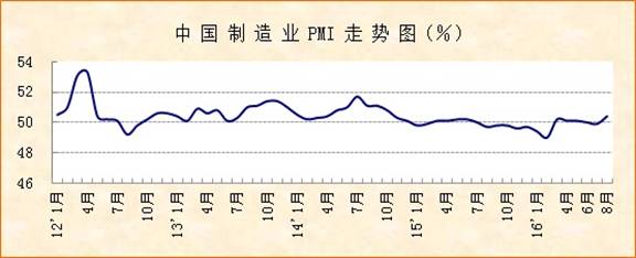 中國物流與采購聯合會、國家統計局服務業調查中心發布的2016年8月份中國制造業采購經理指數(PMI)為50.4%,較上月上升0.5個百分點,為今年以來最為明顯的一次上升。主要分項指數普遍回升,達到去年同期水平以上。綜合來看,當前經濟運行積極變化明顯,市場供需雙雙回升,企業信心增強,預期向好,整體走勢向趨穩方向發展。