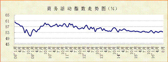 中國(guó)物流與采購(gòu)聯(lián)合會(huì)、國(guó)家統(tǒng)計(jì)局服務(wù)業(yè)調(diào)查中心發(fā)布的2016年8月份中國(guó)非制造業(yè)商務(wù)活動(dòng)指數(shù)環(huán)比回落0.4個(gè)百分點(diǎn),降至53.5%,建筑業(yè)商務(wù)活動(dòng)指數(shù)淡季回調(diào)是本月指數(shù)回落的主因。但是,服務(wù)業(yè)活動(dòng)的持續(xù)回升支撐非制造業(yè)繼續(xù)保持穩(wěn)健運(yùn)行,非制造業(yè)商務(wù)活動(dòng)指數(shù)連續(xù)六個(gè)月穩(wěn)定在53%以上。