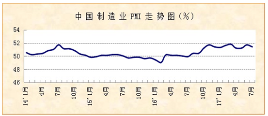 中國物流與采購聯合會、國家統計局服務業調查中心發布的2017年7月份中國制造業采購經理指數(PMI)為51.4%,較上月回落0.3個百分點。但總體來看,指數回落幅度較小,連續10個月保持在51%以上,處在近年來的相對較高水平。