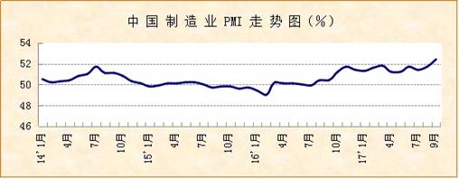 中國物流與采購聯合會、國家統計局服務業調查中心發布的2017年9月份中國制造業采購經理指數(PMI)為52.4%,較上月上升0.7個百分點,指數水平創下近年來新常態經濟形勢下最高記錄。主要分項指數多有上升,升幅明顯,指數水平高于去年同期。總的來看,市場需求上升,價格繼續上漲,生產活動加快,供需銜接良好,企業經營活動活躍,預期較為穩定,多數行業保持恢復性回升,新動力引領作用增強,經濟穩中向好態勢進一步明確。
