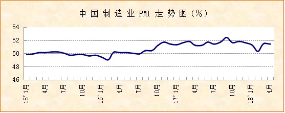 中國物流與采購聯合會、國家統計局服務業調查中心發布的2018年4月份中國制造業采購經理指數(PMI)為51.4%,較上月略微回落0.1個百分點。從主要分項指數來看,多數指數波動較小,整體來看經濟運行平穩,周期性向好態勢進一步顯現。
