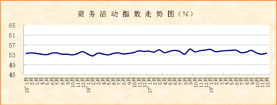 中國物流與采購聯(lián)合會、國家統(tǒng)計局服務(wù)業(yè)調(diào)查中心發(fā)布的2018年12月份中國非制造業(yè)商務(wù)活動指數(shù)達到53.8%,較上月上升0.4個百分點,表明非制造業(yè)經(jīng)營活動較上月有所加快。2018年1-12月,商務(wù)活動指數(shù)均值為54.4%,較2017年小幅回落0.2個百分點,表明非制造業(yè)整體保持較快發(fā)展,為我國經(jīng)濟保持高質(zhì)量發(fā)展奠定了較好的基礎(chǔ)。